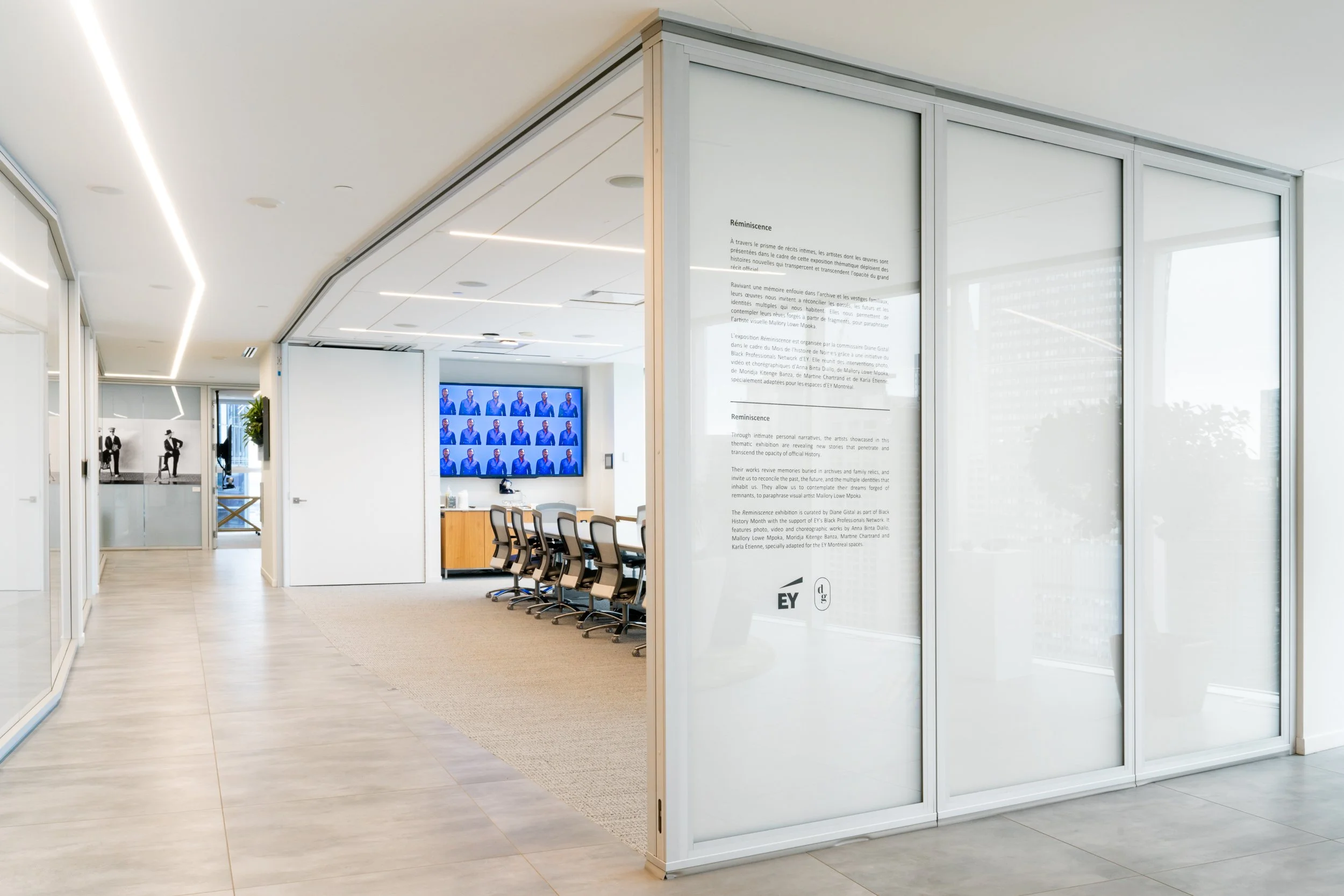 L’exposition Réminiscence est organisée par la commissaire Diane Gistal. Elle réunit des interventions photo, vidéo et chorégraphiques d’Anna Binta Diallo, de Mallory Lowe Mpoka, de Moridja Kitenge Banza, de Martine Chartrand et de Karla Étienne, spécialement adaptées pour les espaces d’EY Montréal.